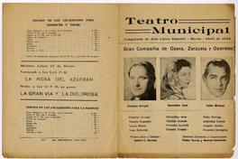 Temporada de arte lírico español : Teatro Municipal : marzo-abril de 1944 : Gran Compañia de Opera, Zarzuela y Opereta. Santiago : Impr. Relámpago, 1944. [1] pleg. : il. .
