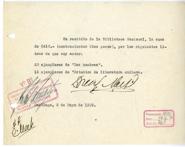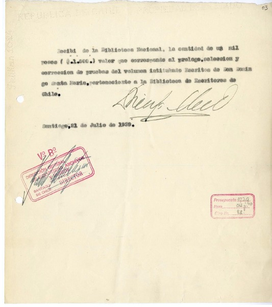 [Recibo] 1939 julio 21, Santiago, Chile [a] Biblioteca Nacional de Chile [manuscrito] Domingo Melfi.