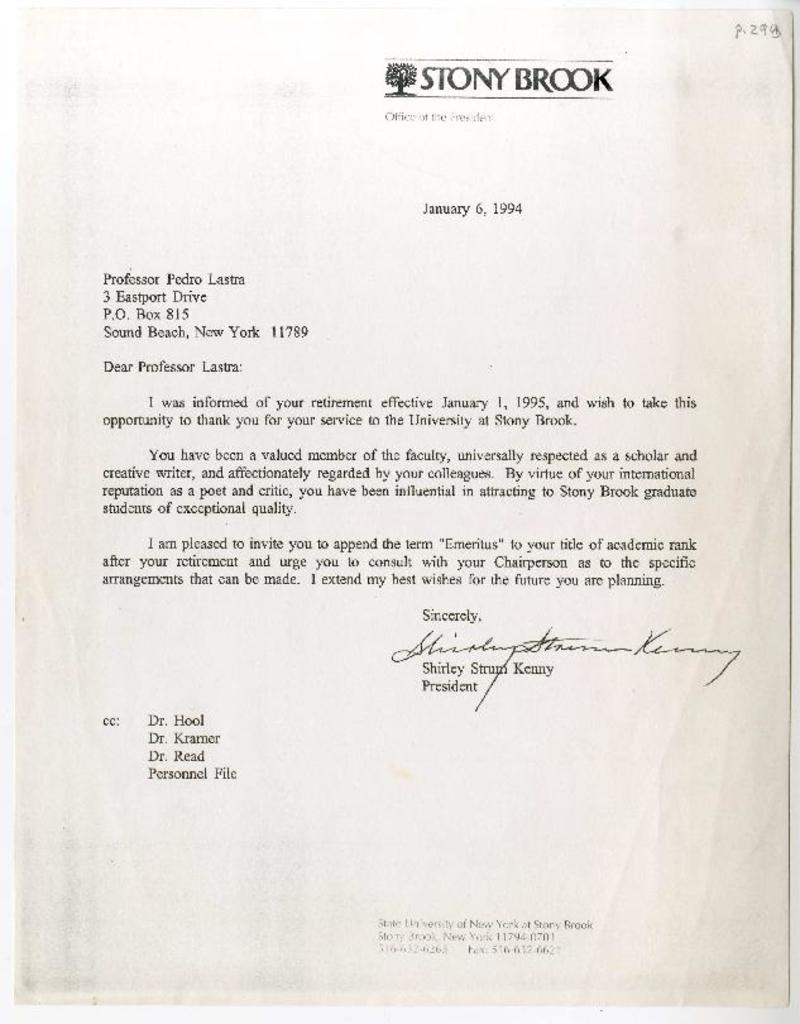 New York [a] Pedro Lastra Carta, 6 de junio 1994, [manuscrito] Shirley Strum Kenny.