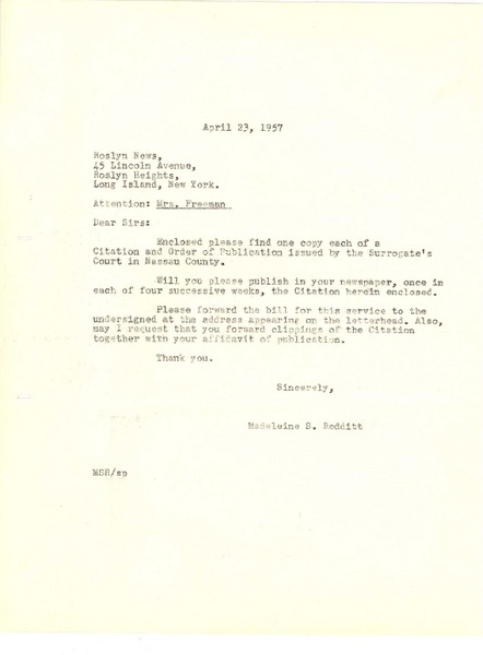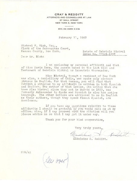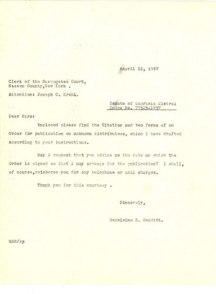 [Carta] 1957 apr. 12, New York [a] Clerk of the Surrogates Court, New York [manuscrito] Madeleine S. Redditt.