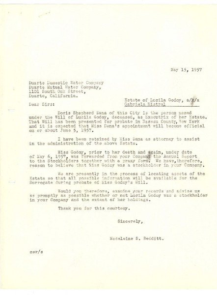 [Carta] 1957 may. 15, New York [a] Duarte Domestic Water Company, California [manuscrito] Madeleine S. Redditt.