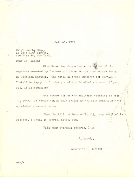 [Carta] 1957 jul. 15, New York [a] Ralph Bosch, Esq., New York [manuscrito] Madeleine S. Redditt.