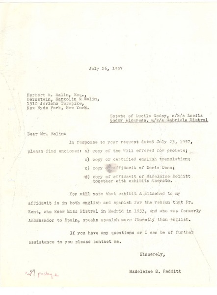 [Carta] 1957 jul. 26, New York [a] Herbert M. Balin, Esq., New York [manuscrito] Madeleine S. Redditt.