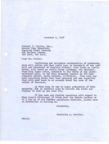 [Carta] 1957 dic. 6, [New York] [a] Richard V. Whalen, Esq., New York [manuscrito] Madeleine S. Redditt.