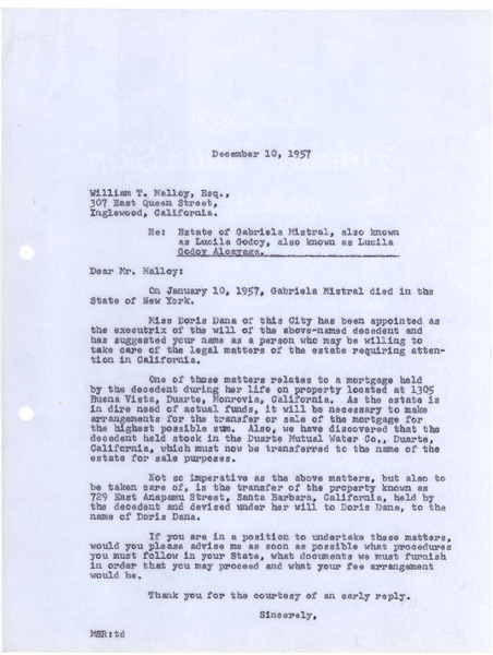 [Carta] 1957 dic. 10, [New York] [a] William T. Malloy, Esq., California [manuscrito] Madeleine S. Redditt.
