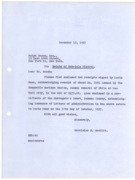 [Carta] 1957 dic. 10, [New York] [a] Ralph Bosch, Esq., New York [manuscrito] Madeleine S. Redditt.