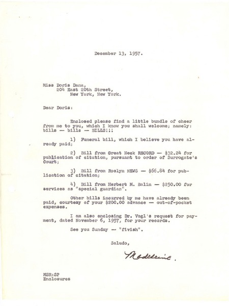 [Carta] 1957 dic. 13, [New York] [a] Doris Dana, New York [manuscrito] Madeleine S. Redditt.