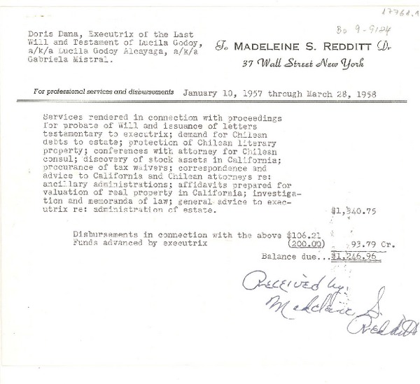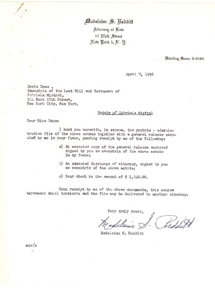 [Carta] 1958 apr. 7, New York [a] Doris Dana, New York [manuscrito] Madeleine S. Redditt.