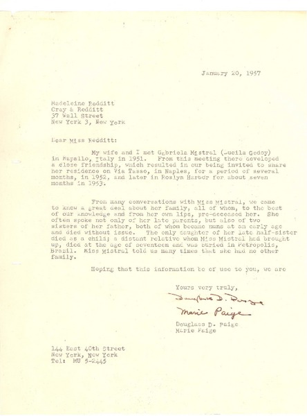 [Carta] 1957 jan. 20, New York [a] Madeleine S. Redditt, New York [manuscrito] Douglass Paige.
