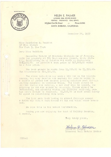 [Carta] 1957 dic. 24, Santa Barbara, California [a] Madeleine Redditt, New York [manuscrito] Helen E. Palmer