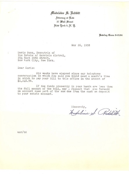 [Carta] 1958 may. 26, New York [a] Doris Dana, New York [manuscrito] Madeleine S. Redditt.