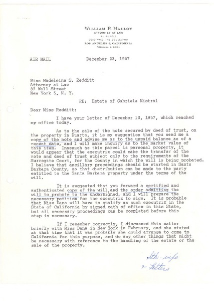 [Carta] 1957 dec. 23, Los Angeles, California [a] Madeleine S. Redditt, New York [manuscrito] William P. Malloy.