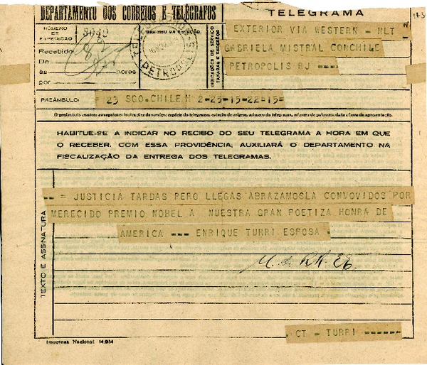 [Telegrama] 1945 nov. 16 [a] Gabriela Mistral, Petrópolis, [Brasil] [manuscrito] Enrique Turri.