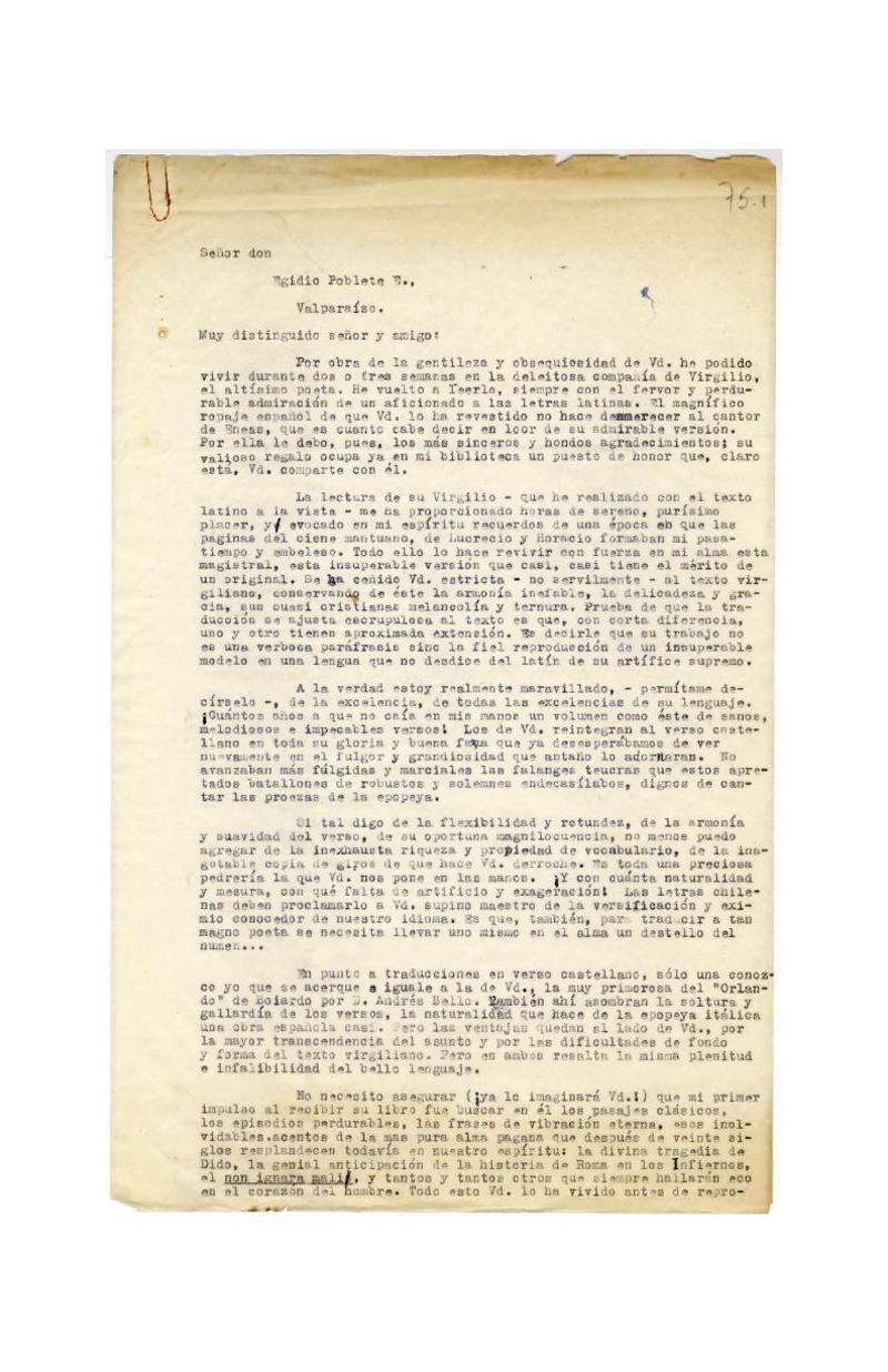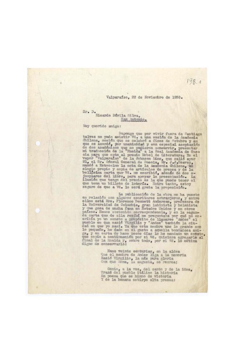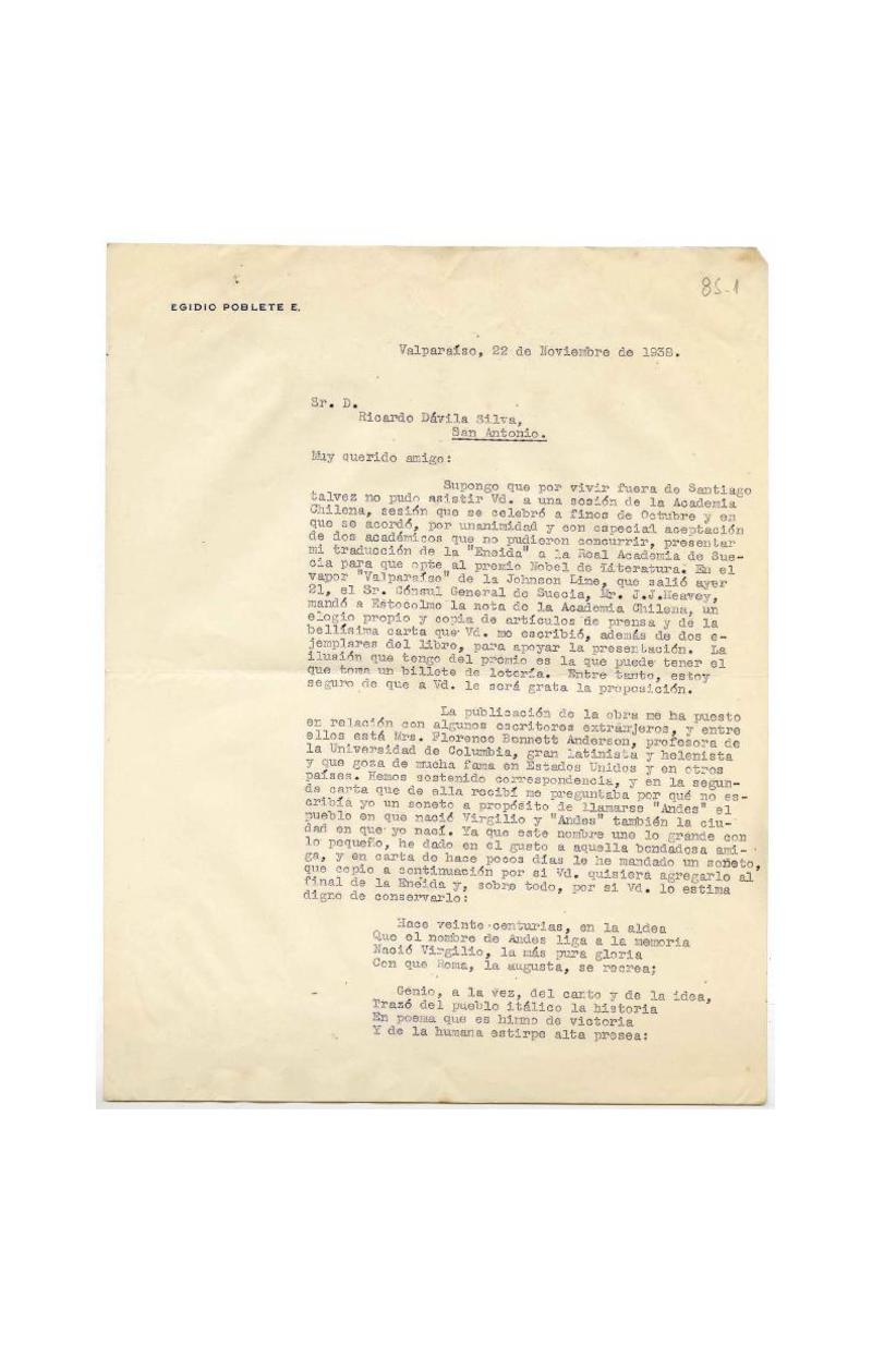 Valparaíso, Chile [a] Ricardo Dávila Carta, 1938 noviembre 22, [manuscrito] Egidio E. Poblete.