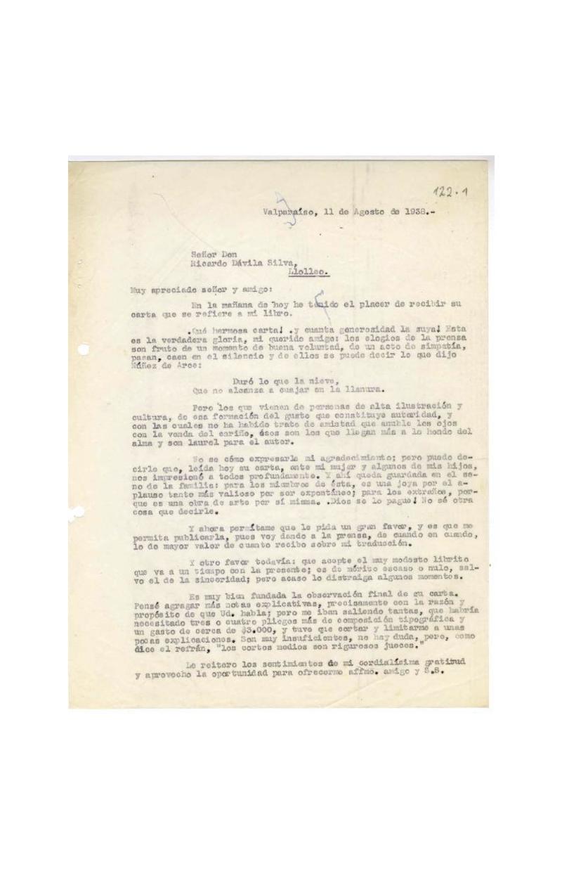 Valparaíso, Chile [a] Ricardo Dávila Silva Carta, 1938 agosto 11, [manuscrito] Egidio Poblete.