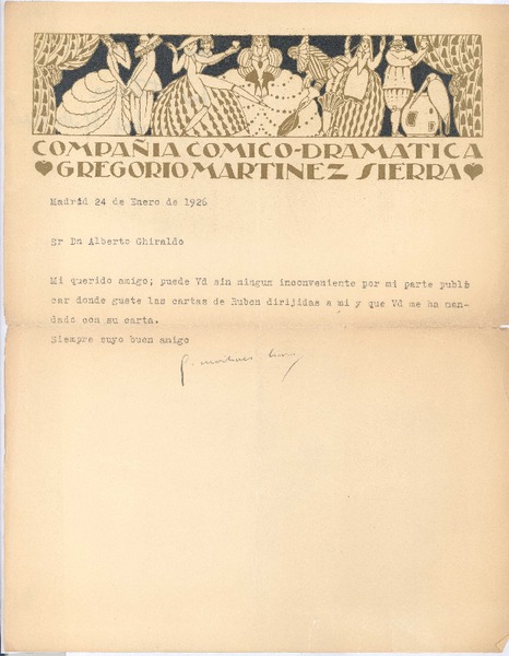 [Carta], 1926 ene. 24 Madrid, España <a> Alberto Ghiraldo [manuscrito] Gregorio Martínez Sierra.