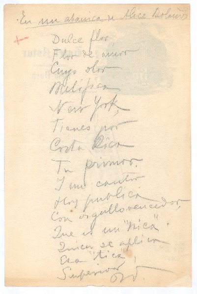 En un abanico de Alice Bolaños [manuscrito] Rubén Darío.