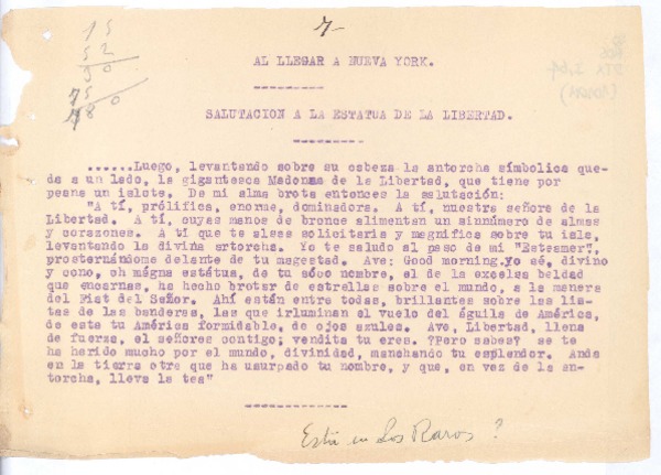 Al llegar a Nueva York Salutación a la estatua de La Libertad. [manuscrito] Rubén Darío.