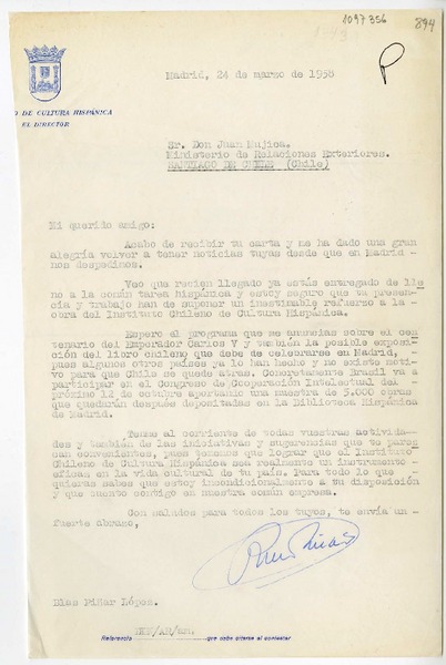 Piñar López, Blas - Correspondencia - Autores chilenos - Autores españoles - Mujica, Juan - Manuscritos españoles