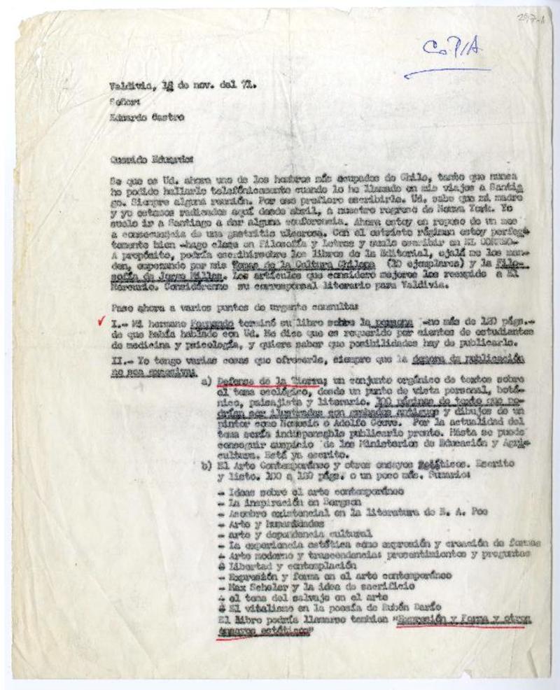 [Carta] 1972 octubre 10, Santiago, Chile [a] Luis Oyarzún [manuscrito] Eduardo Castro Le-Fort.
