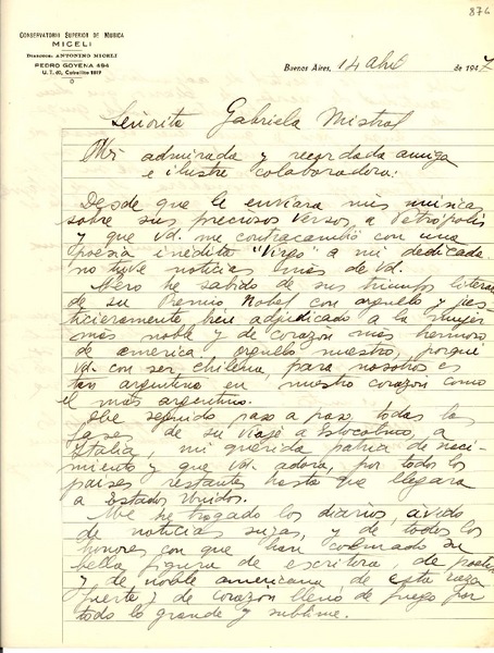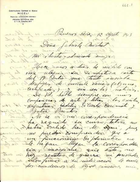 Miceli, Antonino - Manuscritos argentinos - Correspondencia - Mistral, Gabriela