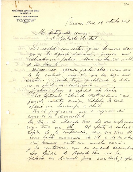 [Carta] 1943 oct. 14, Buenos Aires [a] Gabriela Mistral [manuscrito] Antonino Miceli.