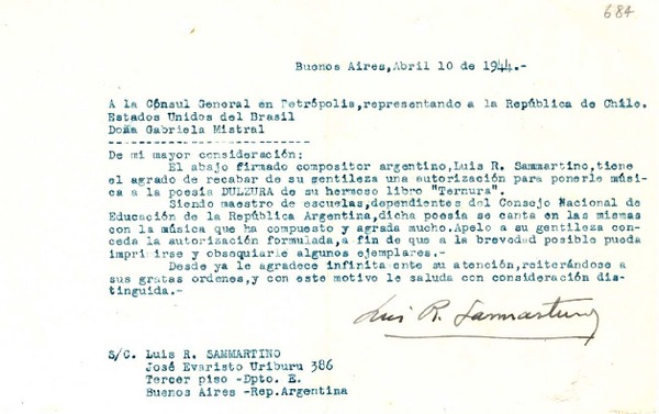 [Carta] 1944 abr. 10, Buenos Aires [a] Gabriela Mistral, Petrópolis [Brasil] [manuscrito] Luis R. Sammartino.