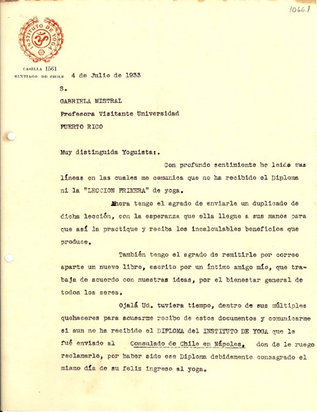 [Carta] 1933 jul. 4, Santiago [a] Gabriela Mistral, Puerto Rico [manuscrito] Benjamín Guzmán Valenzuela.