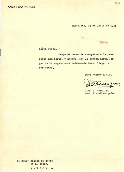 [Carta] 1945 jul. 24, Barcelona, [España] [a] L[ucila] Godoy, Santos, [Brasil?] [manuscrito] Juan L. Campins.