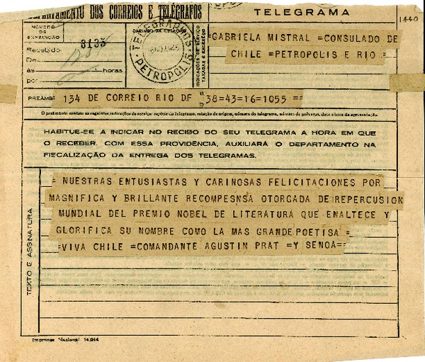 [Telegrama] 1945 nov. 16 [a] Gabriela Mistral, Petrópolis, Brasil [manuscrito] Agustín Prat.
