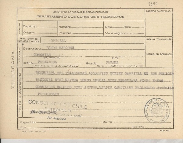 [Telegrama] 1945 nov. 23, Paranaguá, [Brasil] [a] Gabriela Mistral, Petrópolis, Brasil [manuscrito]Ramón Márquez, Cónsul de Chile