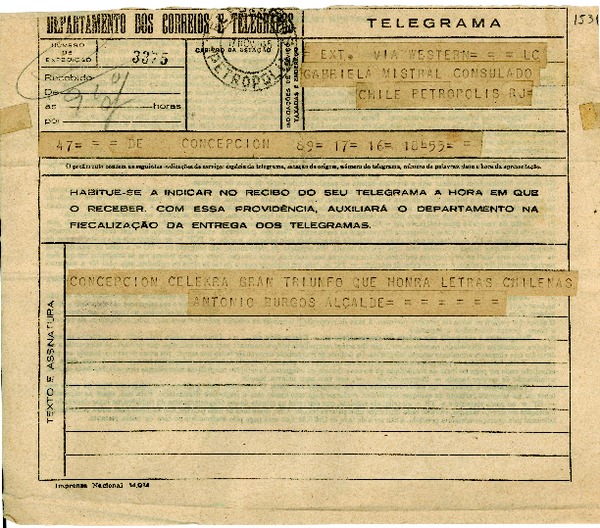 [Telegrama] 1945 nov. 17, Concepción [a] Gabriela Mistral, Petrópolis [manuscrito] Antonio Burgos.