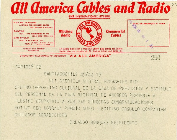 [Telegrama] 1945 nov. 18, Santiago [a] Gabriela Mistral, Río de Janeiro [manuscrito] Orlando Bórquez.