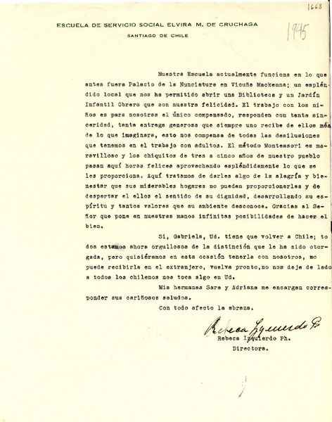 [Carta] 1945 dic. 8, Petrópolis [a] Rebeca Izquierdo Phillips, Directora de la Escuela de Servicio Social "Elvira M. de Cruchaga", Santiago de Chile [manuscrito] Arturo Valdés Phillips.