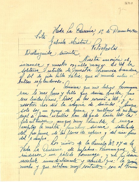 [Carta] 1945 dic. 1, Hacienda La Quesería, [Chile] [a] Gabriela Mistral [manuscrito] Ana Martínez Correa.