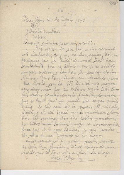 [Carta] 1947 abr. 9, Pisco Elqui, [Chile] [a] Gabriela Mistral [manuscrito] Elisa Vallejo M.