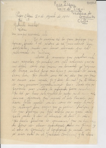 [Carta] 1950 ago. 21, Pisco Elqui, [Chile] [a] Gabriela Mistral, México [manuscrito] Elisa Vallejo Muñiz.