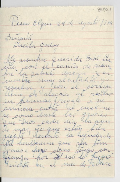 [Carta] 1954 ago. 24, Pisco Elqui, [Chile] [a] Lucila Godoy [manuscrito] Elisa Vallejo [Muñiz].