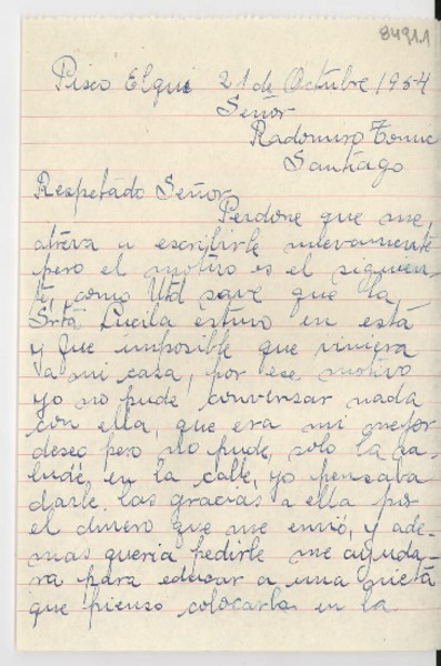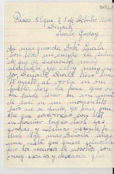 [Carta] 1954 oct. 21, Pisco Elqui, [Chile] [a] Lucila Godoy [manuscrito] Elisa Vallejo [Muñiz].