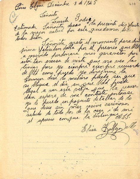 [Carta] 1945 dic. 3, Pisco Elqui, [Chile] [a] Lucila Godoy [manuscrito] Elisa Vallejo M.