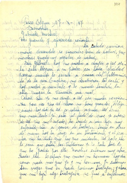 [Carta] 1947 oct. 17, Pisco Elqui, [Chile] [a] Gabriela Mistral [manuscrito] Elisa Vallejo Muñiz.