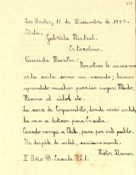 [Carta] 1945 dic. 10, Los Andes, [Chile] [a] Gabriela Mistral, Estocolmo [manuscrito] Héctor Llanos.