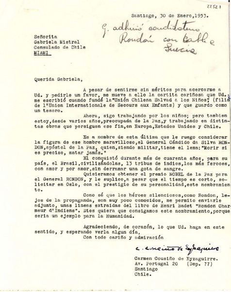 [Carta] 1946 mar. 27, Santiago, Chile [a] Gabriela Mistral, Los Angeles, Calif[ornia], EE.UU. [manuscrito] Carmen Cousiño de Eyzaguirre ... [et al.].