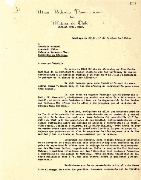 [Carta] 1949 sept. 14, Santiago, [Chile] [a] Gabriela Mistral, Consulado de Chile, Santa Bárbara, [EE.UU.] [manuscrito] Mimí Brieba de Aldunate, Elena Guillier Ariztía.