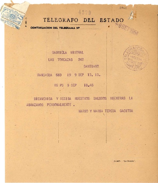 [Telegrama] 1954 sept. 17, Rancagua [a] Doris Dana, Santiago [manuscrito] María Teresa Gacitúa