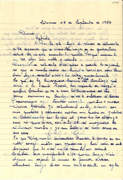[Carta] 1954 sept. 19, Temuco, [Chile] [a] Gabriela [Mistral] [manuscrito] José Gustavo Aravena Ramos.