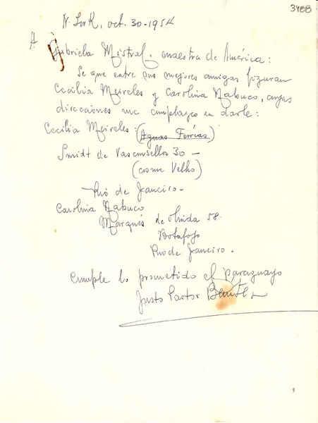 [Carta] 1954 oct. 30, Nueva York [a] Gabriela Mistral [manuscrito] Justo Pastor Benítez.