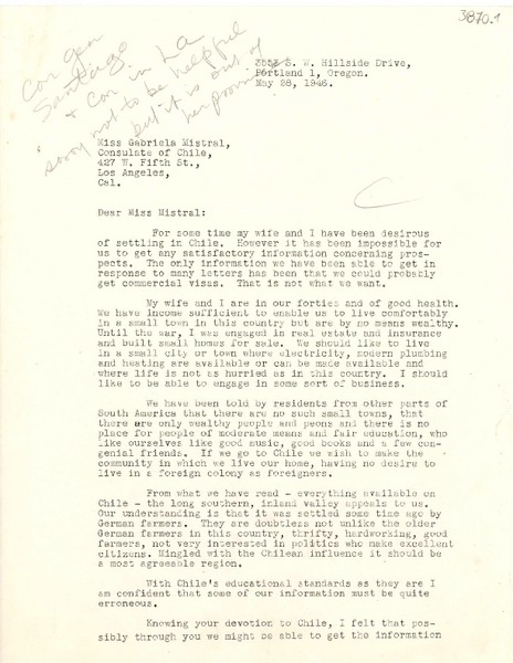 [Carta] 1946 mayo 28, Portland, Oregon [a] Gabriela Mistral, Los Ángeles, California [manuscrito] Robert F. Budrow.