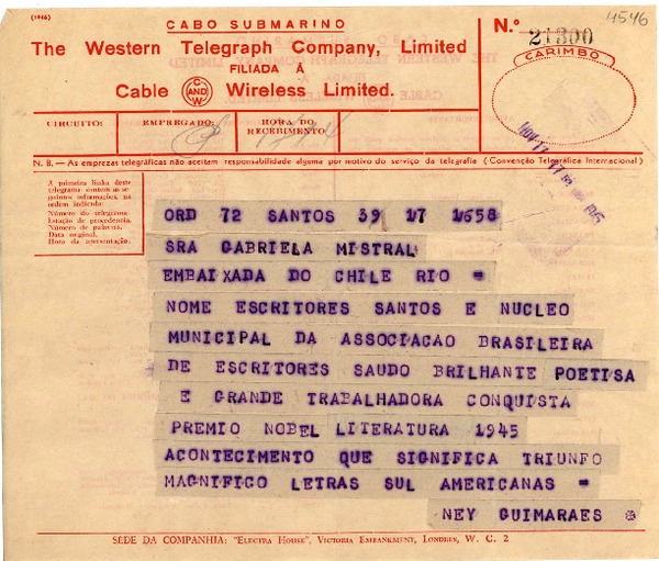 [Telegrama] 1945 nov. 17, Santos, [Brasil] [a] Gabriela Mistral, Río de Janeiro [manuscrito] Ney Guimaraes.