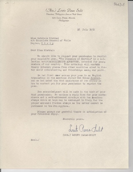 [Carta] [1952], [Italia] [a] Loreto Paras-Sulit, Manila, Filipinas [manuscrito] Gabriela Mistral.